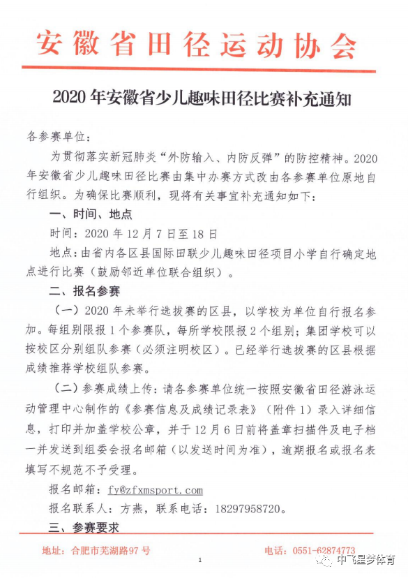 ▲上下滑动查看更多12月12日,2020年安徽省少儿趣味田径比赛滁州市湖心路小学分赛场顺利开赛。受疫情影响,为彻底贯彻落实“外防输入、内防反弹”的防控精神,今年安徽省少儿趣味田径运动会由往年现场集中参赛改为各参赛单位自行组织进行。本次滁州市湖心路小学分赛场参赛组别为三年级组、四年级组。短跑/跨栏接力、十字跳、投掷软标枪、越过障碍掷准、跪投实心球(1公斤)、一级方程式