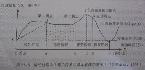 从整体机能反应的角度分析,运动生理负荷反应的基本规律表现为四个阶段和五个关键点。他们分别是动员阶段、稳定阶段、疲劳阶段、恢复阶段和第一拐点(第二次呼吸点)、第二拐点(疲劳始点)、负荷强度极大值点、运动终点、转折点(恢复点)如图所示。