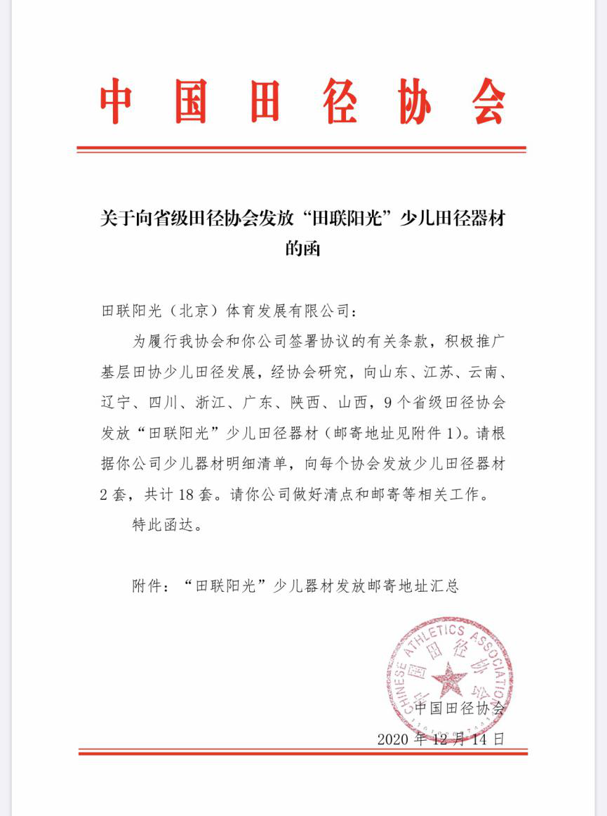 近日,中国田径协会携手田联阳光(北京)体育发展有限公司首批向全国9省市体育局捐赠了少儿田径软式体育器材一批,用于这些省市组织进行少儿田径赛事、指导员培训、少儿田径进校园等推广活动,普及田径知识技能,不断加强体教融合。据悉,中国田径协会已经确定将少儿田径指导员培训列入新的中国田径教练员培训体系,将在全国组织系统的大规模的培训。